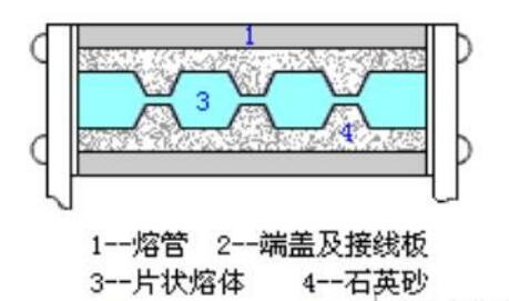 另外一种如下图所示。熔体装在有绝缘砂粒填料(如石英砂)的熔管内,在熔体断开电路产生电弧时,绝缘砂粒可吸收电弧能量,金属蒸气能散发到砂粒的缝隙中,熔体很快冷却,从而达到灭弧的目的。
